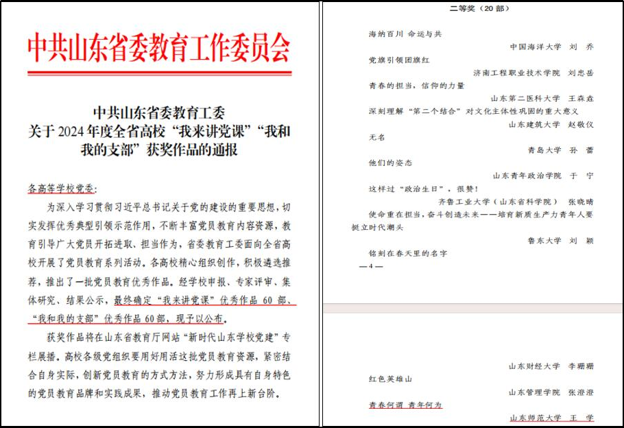 近日,中共山东省委教育工委公布了2024年度全省高校“我来讲党课”“我和我的支部”获奖作品,我院辅导员王学的党课作品《青春何谓 青年何为》荣获“我来讲党课”二等奖。