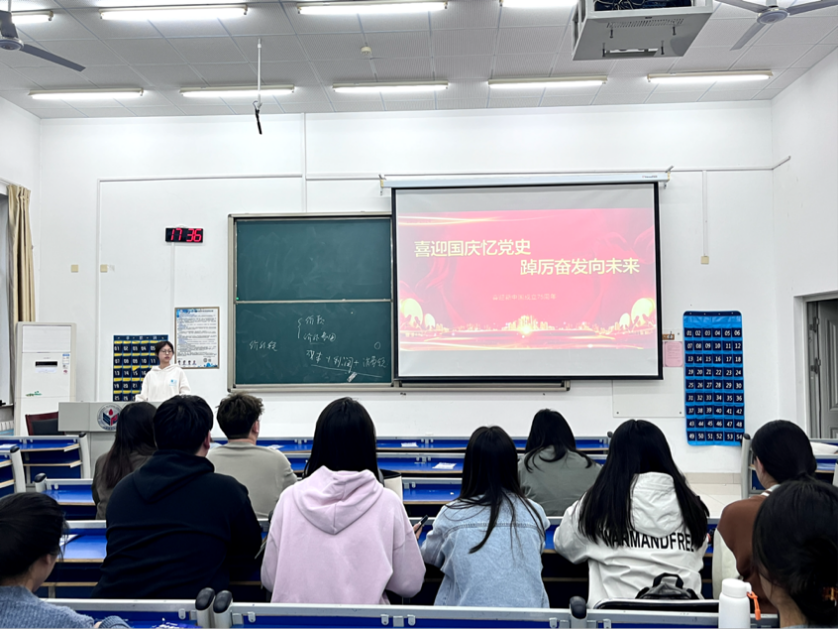 为热烈庆祝中华人民共和国成立75周年,2024年10月9日下午,经济学院本科生第一党支部在厚德楼105教室开展“党课我来讲”理论学习活动第25期,围绕“喜迎国庆忆党史,踔厉奋发向未来”为主题展开学习,经济学院本科生第一党支部党员彭鑫瑶主讲,支部全体党员参与学习。