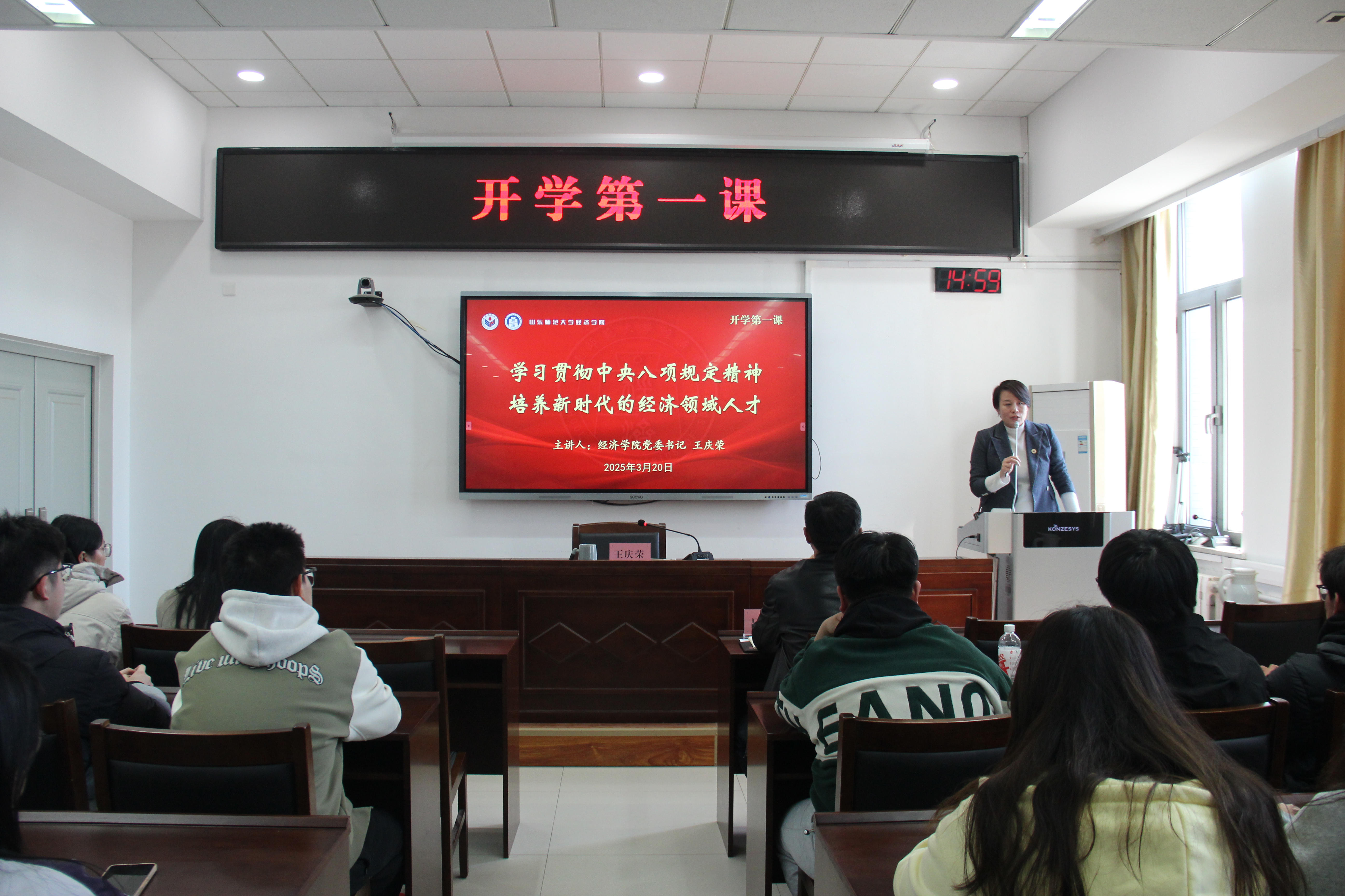 3月20日,经济学院在厚德楼429会议室举行新学期开学第一课活动。学院党委书记王庆荣以《学习贯彻中央八项规定精神,培育新时代经济领域人才》为题作专题授课,党委副书记、纪委书记吕益国主持活动,学院学生党员、入党积极分子等80余人参加学习。