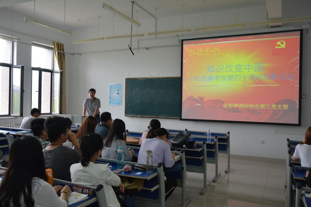 四十年风雨变迁,高考点亮了无数希望。为纪念恢复高考四十周年,6月8日,经济学院于长清湖校区经济学院综合楼311教室举办支部“弘毅讲堂”之“知识改变中国——恢复高考四十周年”主题纪念活动,经济学院本科生第二党支部书记吕益国担任活动主持人,2014级全体党员及预备党员共同参与了此次纪念活动。