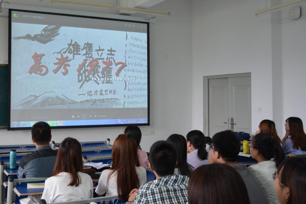 随后,支部组织大家观看纪录片《高考1977》,旨在通过视频的感染力,让同学们深刻体会1977年恢复高考那段历史的伟大。该纪录片以1977年文革结束、各行各业百废俱兴为背景,讲述了东北某农场内一群身份背景各异的知青为参加高考而共同奋斗,最终各得其所的故事。影片以小见大,以几个小人物的经历映射时代共性,情节丝丝入扣,人物形象生动鲜活,情感丰富饱满,以充满张力的表演展示了恢复高考初期人们对知识的渴望以及对未来的美好希望。影片放映结束后,2014级金融一班朱琳表示,知识改变命运,四十年来恢复高考的最大意义就在于不断地实现人才选拔制度的公平,为渴望改变命运的有志青年提供上升通道。