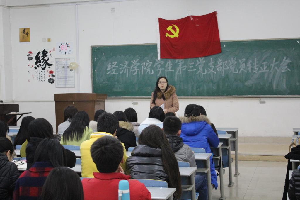 12月28日,经济学院学生第三党支部党员转正大会在长清校区综合教学楼C区323教室召开,会议由党支部青年委员赵敏主持。