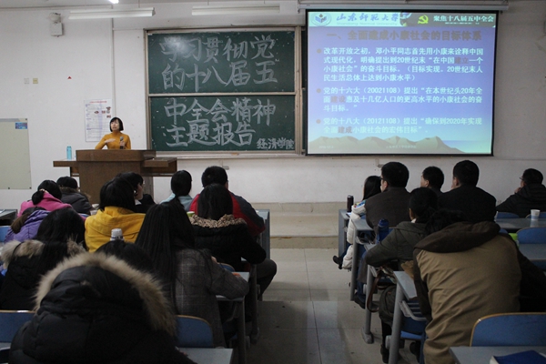 为深入学习贯彻党的十八届五中全会精神,带领师生准确把握“十三五”时期我国经济社会发展的指导思想、总体思路、目标任务、重大举措,将思想和行动统一到党中央的决策部署上来,12月3日,学校党的十八届五中全会精神宣讲会在长清湖校区综合教学楼C区117教室举行,学校党的十八届五中全会精神宣讲团成员、经济学院硕士生导师包玉香教授作了题为《五大发展理念与全面建成小康社会——对“十三五”规划建议的理解》的主题报告。报告会由经济学院党委副书记刘永慧主持,学院部分领导、教工党员及研究生、本科生党员和入党积极分子聆听了报告。