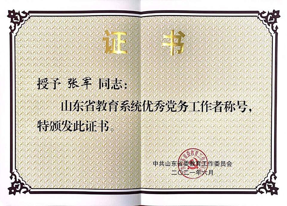 作为一名有34年党龄、20余年党建工作经历的党务工作者,张军同志全面理解和贯彻新时代党的建设总要求,充分发挥党建工作指方向、聚人心、提干劲、汇资源的作用,注重工作实效,多次获得“学习强国”学习平台先进个人、省干部网络学院优秀学员等荣誉,主持多项党建研究课题,获山东高校党的建设研究优秀成果一等奖等奖项10余项,带领学院获得山东省“五四红旗团组织”、校“先进基层党组织”“十佳单位”“三八红旗手(标兵集体)”等荣誉称号。