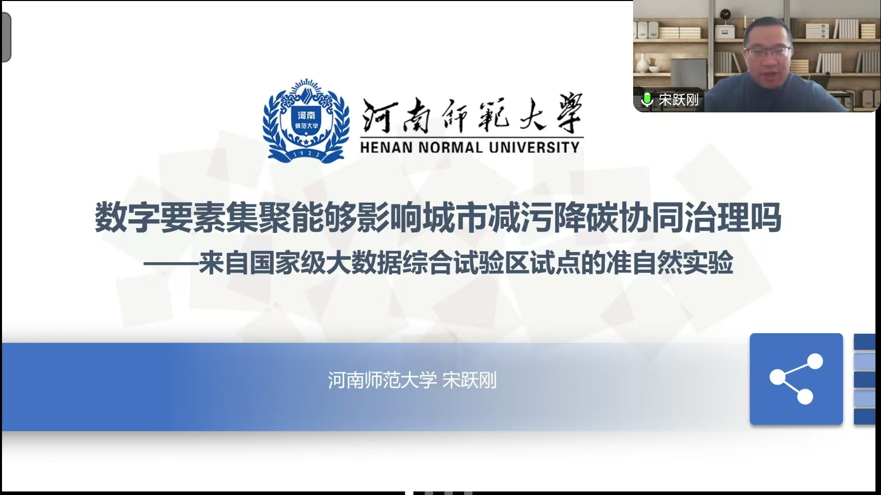 2024年12月5日,经济学院在线举办第八期“湖畔经济论坛”。此次讲座邀请河南师范大学宋跃刚副教授,分享题为《数据要素集聚能够影响城市减污降碳协同治理吗——来自国家大数据综合试验区的准自然实验》的学术成果。讲座由经济系主任辛大楞教授主持,学院部分教师和研究生在线聆听。