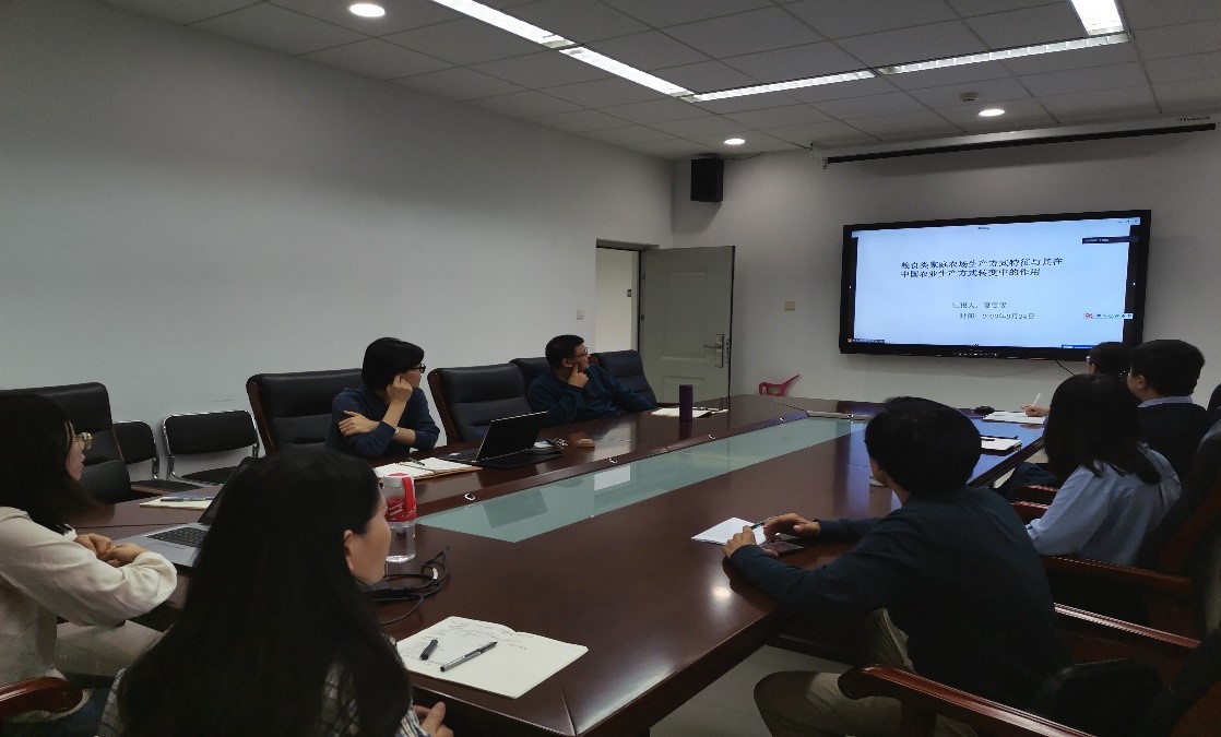 夏雯雯博士从研究背景、家庭农场和生产方式的两组概念引入、从家庭农场的溯源、家庭农场的生产方式特征、中国农业生产方式阶段性特征分析、研究结论等方面进行了汇报。通过描述性分析的方法发现家庭农场具有适度规模化、较高机械化生产特征,并且显现出明显的绿色化生产特征。家庭农场呈现出的此类生产方式特征与中国农业生产方式转变的方向是相呼应的,并且,家庭农场作为现阶段契合农业经济发展规律的生产主体,在一定程度上可以认为,家庭农场是现阶段中国农业生产方式转变的重要载体。