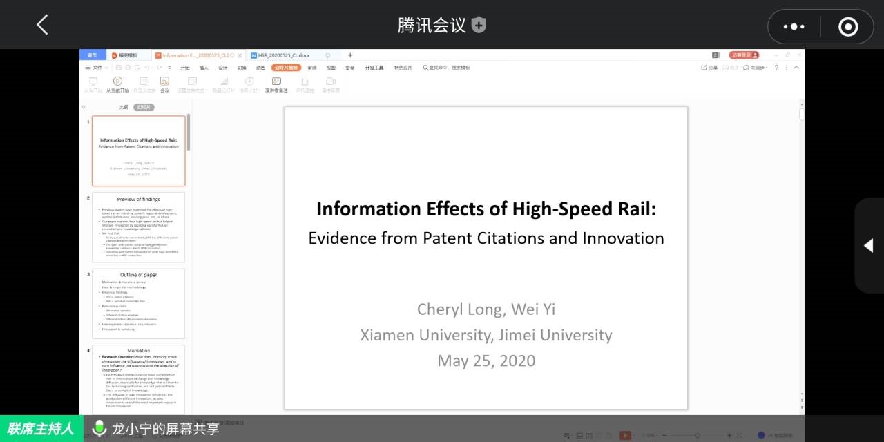 5月25日下午,厦门大学龙小宁教授做客山东师范大学社科大讲坛第981期,做了题为“Information Effects of High-Speed Rail: Evidence from Patent Citations and Innovation”的讲座。此次讲座依托腾讯会议平台线上进行。讲座由经济学院副院长丁淑娟教授主持,经济学院全体师生一同在线聆听讲座。