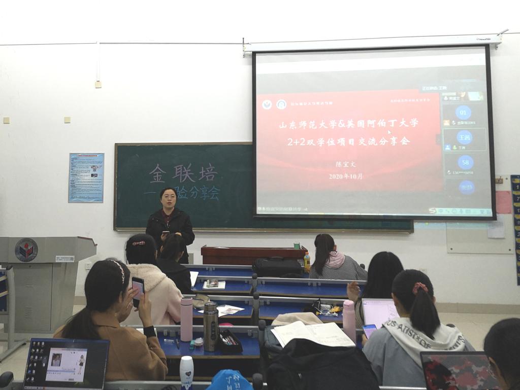 10月25日晚,经济学院于厚德楼103教室在举行留学经验分享会。经济学院学生工作办公室主任、团委书记王茜,2016级毕业生陈宜文出席此次会议。会议由王茜主持,陈宜文担任主讲,金联培2001班全体同学参加。