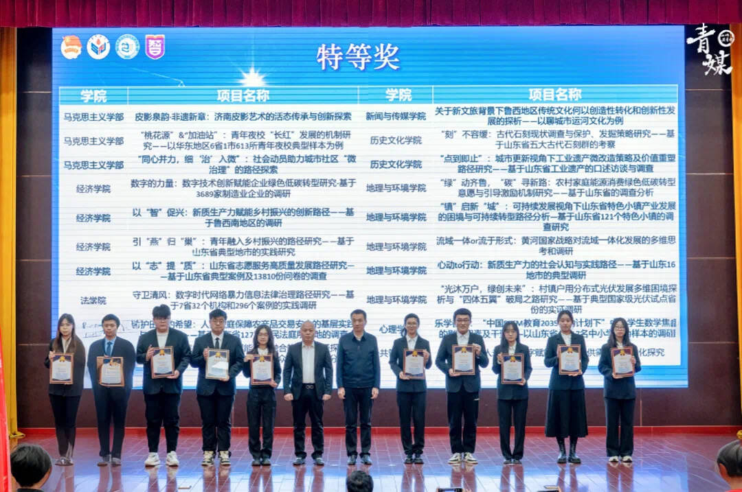 《以“志”提“质”:山东省志愿服务高质量发展路径研究——基于山东省典型案例与 13810 份问卷的调查》通过研究山东省志愿服务发展的典型案例,提炼总结出志愿服务高质量发展的有效路径。《以“智”促兴:新质生产力赋能乡村振兴的创新路径——基于鲁西南地区的调研》深度分析了鲁西南地区乡村振兴所面临的现存困境,科学且极具针对性地提出了具有广泛推广与借鉴意义的新质生产力赋能乡村振兴的发展策略与路径。《数字的力量:数字技术创新赋能企业绿色低碳转型研究——基于 3689 家制造业企业的调研》针对全国微观企业中数字技术应用对企业节能减排的实际成效展开调研与分析研究,并对当前提升发展路径中存在的堵点问题提供精准的对策建议。《引“燕”归“巢”:青年融入乡村振兴的路径研究——基于山东省典型地市的实践探索》专注于青年助力乡村振兴的路径探寻,归纳梳理出青年赋能乡村振兴的山东特色经验与模式。以上这四个项目均荣获哲学社会科学类调查报告组特等奖。而《澈影智云——智慧水务与全局监理 AI 赋能方案的提供商》凭借自研的多功能智能传感器以及智能水务大模型这两大核心技术,创新性的构建出污水处理领域的工业互联网体系,成功突破制约城市水务运营的瓶颈问题,最终荣获创业组特等奖。