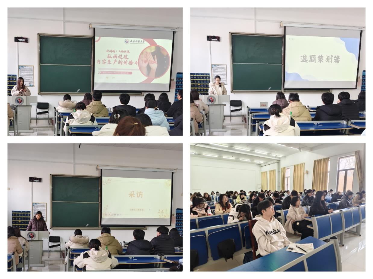 三位主讲人分别就稿件撰写、选题策划和采访方面展开讲解。刘雪详细介绍了新闻稿和人物访谈稿的撰写方法,向同学们推荐了创客贴平台,并分享了实用的操作技巧。李卓羲从人物访谈类、热点类等选题角度展开介绍,分享了自己的策划模板,强调策划时应具备热点敏感度和多元化思维,提升文章的整体价值。李琰璘针对人物采访环节进行介绍,重点讲解了如何选择采访对象、沟通礼仪、应对采访中的突发状况以及采访后的总结写稿事项。她强调,采访工作需严谨、求新和灵活,以确保采访效果的最佳呈现。