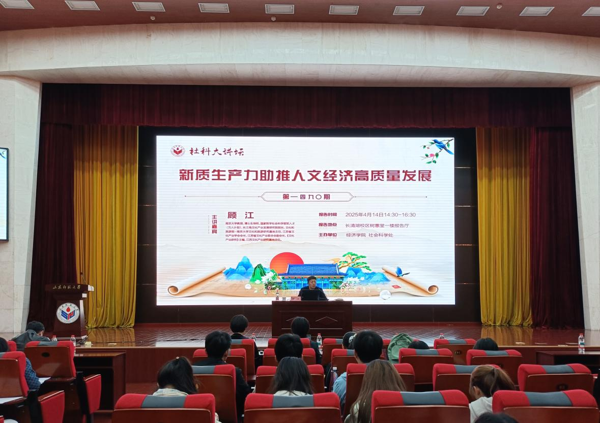 4月14日下午,经济学院于长清湖校区树蕙堂报告厅举办第1490期社科大讲坛。教育部哲学社会科学领军人才、长三角文化产业发展研究院院长、南京大学顾江教授受邀作题为《新质生产力助推人文经济高质量发展》的学术报告。经济学院党委书记王庆荣主持报告会,经济学院师生代表200余人参与活动。