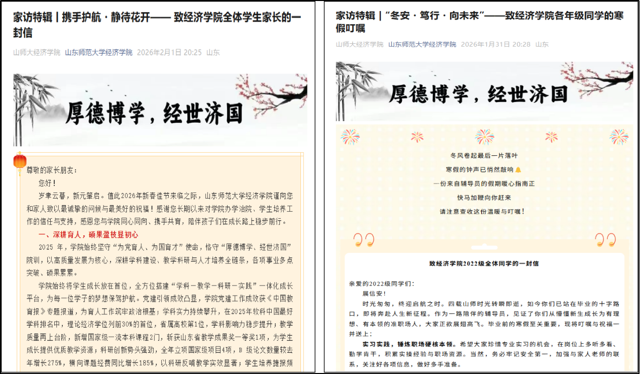 在入户家访的基础上,学院积极创新举措,推出“家访特辑”系列书信,线上发布《携手护航・静待花开——致经济学院全体学生家长的一封信》和《“冬安・笃行・向未来”——致经济学院各年级同学的寒假叮嘱》,帮助家长、学生全面了解学校、学院培养目标与未来发展规划。除此之外,学院不断扩大家访学生覆盖面,在入户实地家访的同时还充分利用网络视频、电话等方式与部分家庭经济困难、学业困难、大学生活适应困难、就业困难学生的家长进行针对性交流,进一步加强家校沟通,实现协同育人。