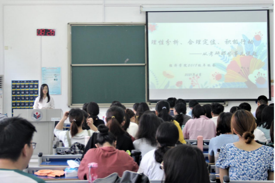 经济学院始终把面对面、心贴心的交流沟通作为最重要的思政工作手段,在学院党委的亲自部署、支持、推动下,各年级坚持每月召开一次年级会、进行一次班委述职测评,每班坚持每月召开两次班会,同时通过辅导员午餐会、院长书记下午茶、“与你相寓”师生宿舍交流会等形式不断拓宽师生交流共同渠道。为总结提升前期工作成果,本次工作交流选取经济学院2018级辅导员王学的年级会《理性分析、合理定位、积极行动——从考研那些事儿说起》为切入点,以观摩、研讨的形式,加强工作交流。