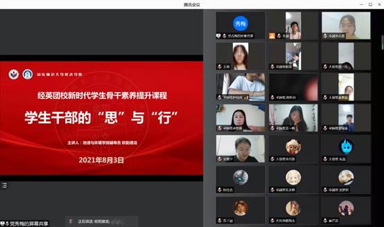为提高2020级学生干部和经英团校学员综合素质,深化思想认识,8月3日,经济学院经英团校通过腾讯会议平台开展以“学生干部的‘思’与‘行’”为主题的新时期学生骨干素养提升课程。本次活动邀请地理与环境学院辅导员欧阳德龙主讲,活动由经济学院辅导员朱灏主持,经济学院经英团校第三期全体学员及2020级学生干部参加会议。