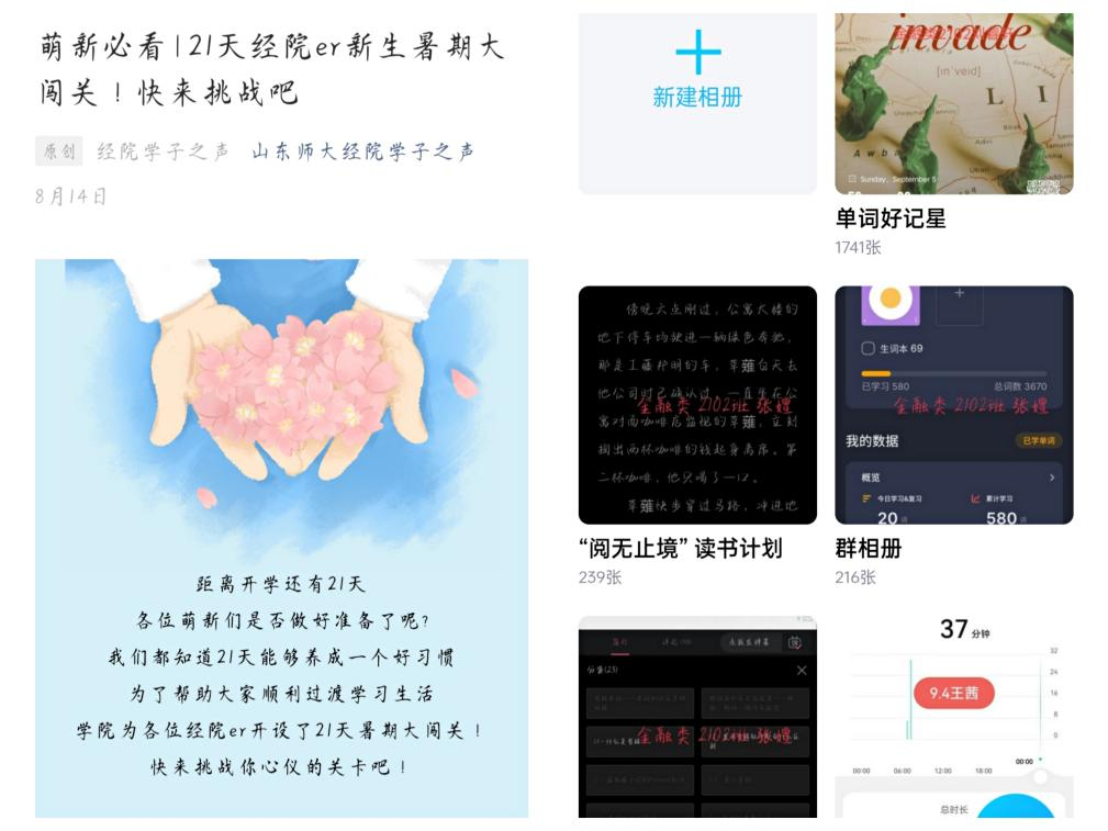 走过蝉声鼎沸的盛夏,经济学院与2021级新生共成长。青春如酒,成长正酣。从新生接到录取通知书的那一天,经济学院就积极部署,提前开始了入学教育。在新生年级群里,辅导员和导航员每天为新生答疑解惑,进行思想引领。在距离开学还有21天的时候,学院特别推出“21天养成计划”,21级与21天精彩碰撞,擦出不一样的火花。“单词好记星”、“新技能‘充电站’”、“‘阅无止境’读书计划”、“‘keep sport’燃卡计划”等活动,帮助新同学们养成良好的学习生活习惯,以最好的精神面貌步入大学,为适应大学生活做好准备。萌新们积极参与活动,每日按时完成打卡,将活动成果上传到群相册中。参与打卡的李鑫蕊同学说:“很开心参与这个活动,使我在假期里学会了运用ps、视频剪辑等新技能,接触到新的领域,收获到颇有意义的新知识。”成长的过程就是破茧成蝶,挣扎的褪掉所有的青涩,在阳光下抖动轻盈美丽的翅膀。经济学院与2021级新生携手相伴,共同成长,在这个春华秋实的季节里收获属于自己的小美好。
