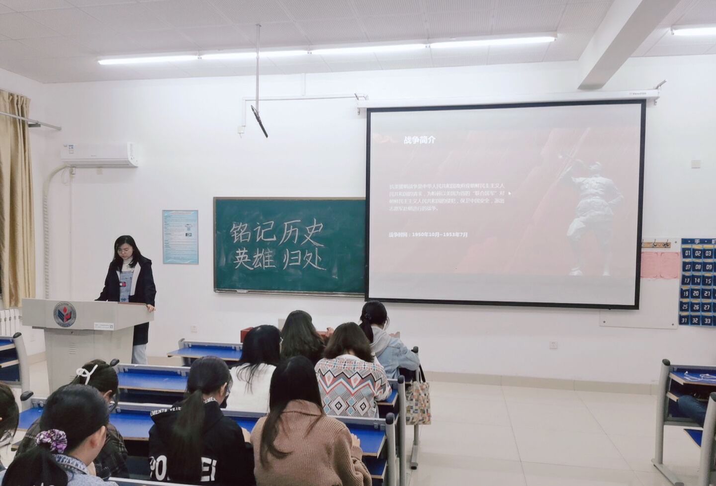为纪念抗美援朝七十周年,向英雄致敬,学习革命英雄主义精神,提高团员素质,进一步加强团支部思想建设,10月22日,经济学院金融本1901班开展抗美援朝主题团日活动,团支部书记周欣怡担任主讲,全班同学到场学习。