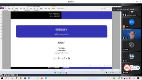 为提升教育教学水平,切实提高学生的课堂教学体验,经济学院于12月8日以线上的形式举办了《微观经济学》竞课活动。该活动由院长助理李佳主持,党委书记张军、执行院长乔翠霞、金融系主任张凤兵、经济系主任辛大楞、国贸系主任沈明伟、校级督导专家包玉香出席会议,部分青年教师参与观摩。
