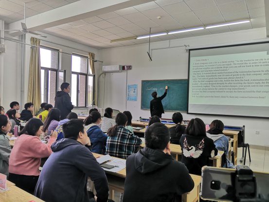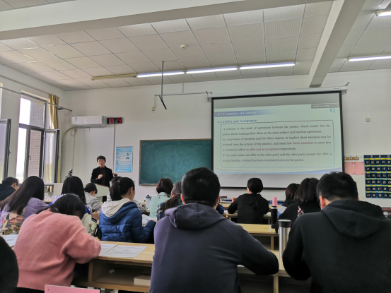 本次观摩课分为讲课和研讨两个环节。教学环节,宁静波老师对合同法章节的讲解深入浅出,师生互动频繁,学生回答问题积极。研讨环节,商学院老师就英文课程建设等问题与宁静波老师进行了交流,得到一些建设性意见。