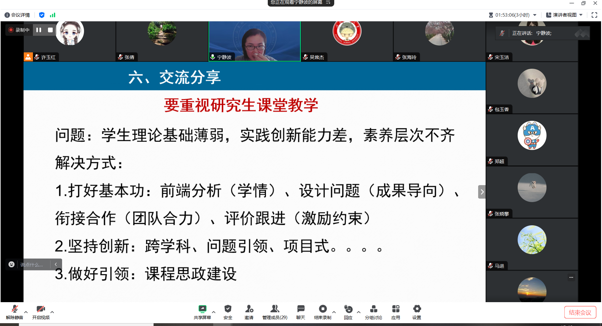 任课教师说课之后,校督导组专家包玉香教授进行了点评总结。包老师充分肯定了各位任课老师的用心设计,从教学督导的角度提出了选修课应重视拓展学生知识面、结合学生论文写作、突出前沿和热点问题等建议。宁静波副院长进一步指出,要高度重视研究生教学,加强学情分析,明确课程定位。第三学期的课程更应注重高阶性、系统性、启发性,专硕要更加重视研究生实践能力的培养,鼓励开展项目式教学,提升案例质量。最后,张军书记进行了总结发言。张书记对老师们的汇报表示了充分认可,指出老师们应不断优化教学模式,取长补短,并强调一定要重视课程思政,以高质量的研究生教学促进经济学院的内涵建设。