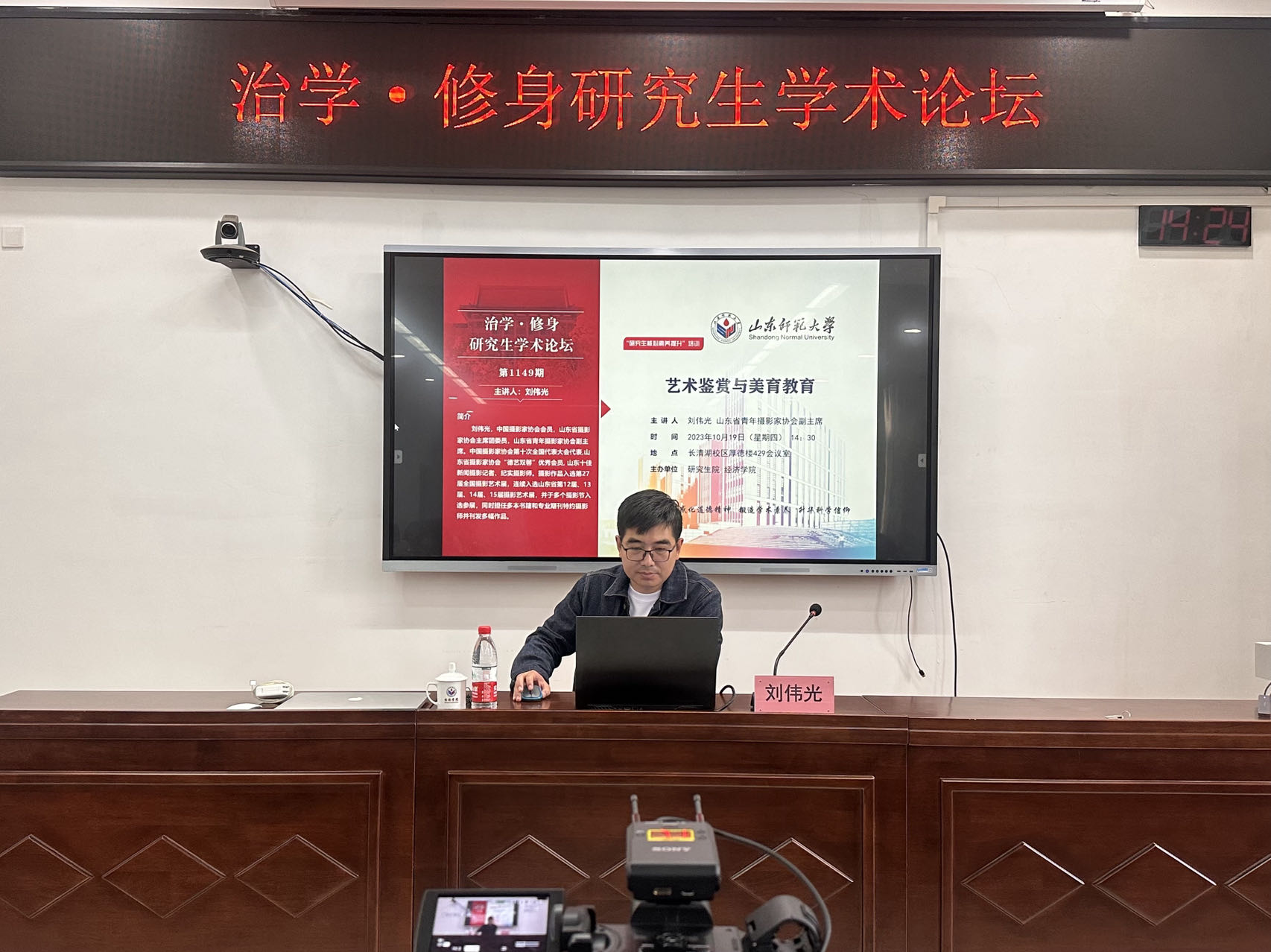 10月19日,经济学院于厚德楼429室举办“治学·修身”研究生学术论坛。此次学术论坛由山东省青年摄影家协会副主席刘伟光担任主讲人,做主题为“艺术鉴赏与美育教育”的报告。会议由经济学院研究生辅导员孙资程主持,经济学院研究生、本科生到场聆听。