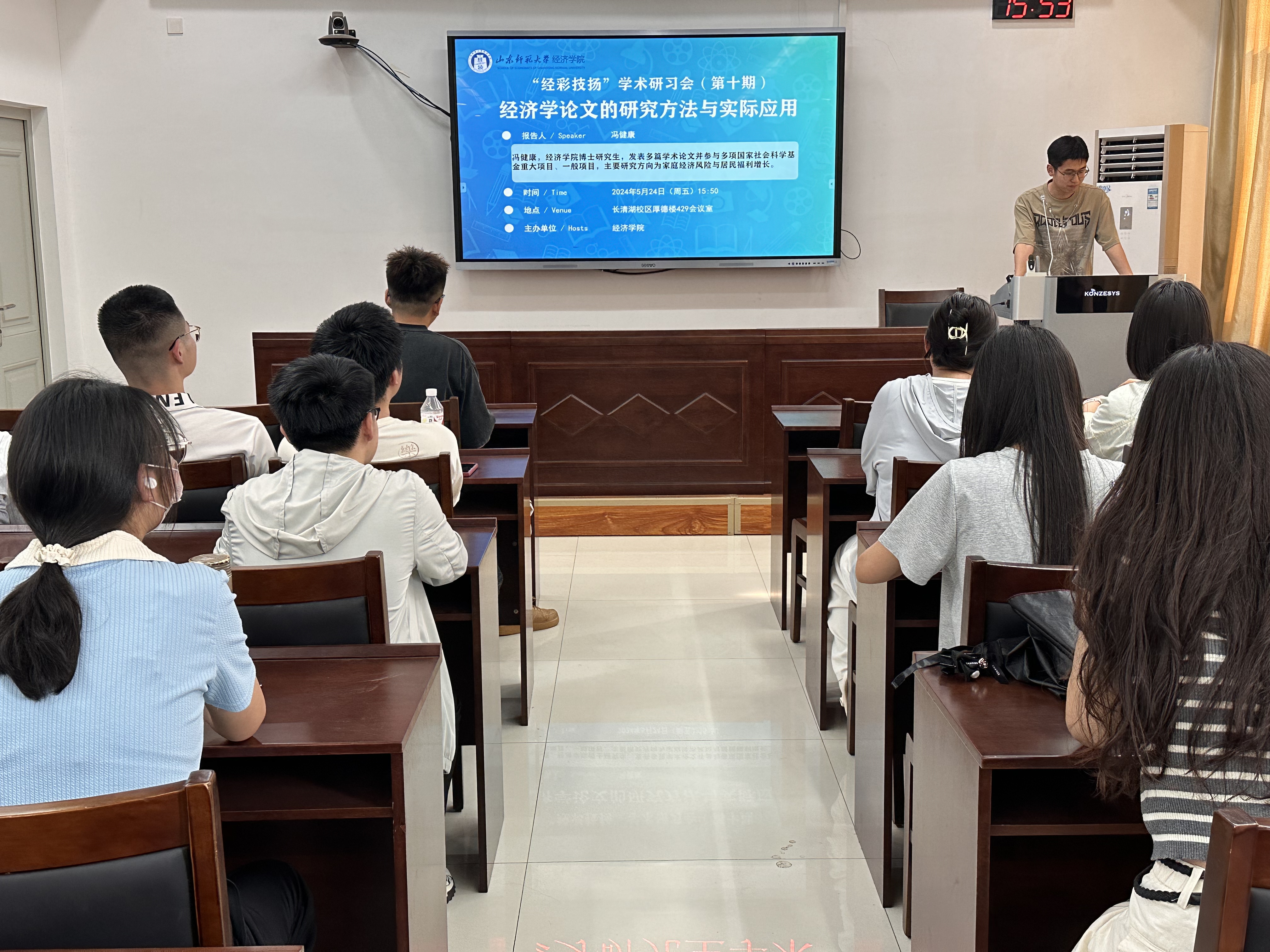 5月24日,经济学院于厚德楼429室举办“经彩技扬”学术研习会。此次研习会由经济学院博士研究生冯健康担任主讲人,作主题为《经济学论文的研究方法与实际应用》的学术报告,学院研究生参会。