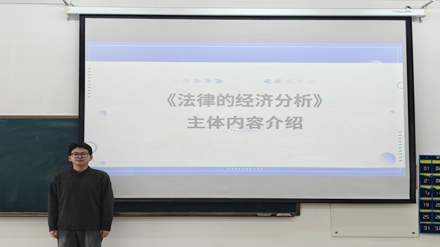 主讲人韩沅成同学分享了理查德·艾伦·波斯纳所著的《法律的经济分析》。他以作者理查德·艾伦·波斯纳在法经济学领域的奠基性贡献为论述起点,讲解了波斯纳将成本收益分析、效率最优分析等经济学范式注入法学理论体系所引发的范式革命,引导同学们关注跨学科方法论对于现代法学研究的创新价值。随后主讲人阐述了书中的主要内容和核心思想,强调法律体系须秉持效率优先原则——构建行为规制框架,肩负资源最优配置与矫正市场机制偏差的双重使命。最后,主讲人分享了个人的读书体会,学术探索既要恪守本专业精微要义,更需通过跨域知识迁移实现学科边界突破,这种"深耕-辐射"的思维范式恰是学术创新的催化剂。