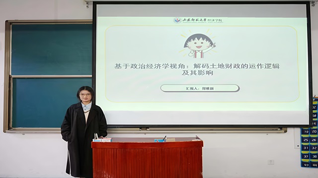 主讲人郑雅新同学参考了《以利为利》《置身事内》两本书,作主题为“基于政治经济学视角:解码土地财政的运作逻辑及其影响”的分享。她首先简要概述了两本书籍的主要内容,并通过具体数据阐述了当前土地财政的规模,指出土地财政不仅是地方政府收入的重要来源,更是推动城市化的核心动力。其次,主讲人分析了土地金融的杠杆效应。她以城投公司为例,详细讲解了地方政府如何通过“土地—财政—金融”三位一体的模式进行融资。最后,主讲人总结了土地财政带来的一系列问题,并提出通过"制度重构-税源培育-债务化解"三重路径,实现从土地依赖型财政模式向可持续发展型财政模式转变。