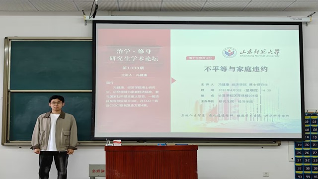 4月3日,经济学院于厚德楼204室举办“治学·修身”研究生学术论坛。此次学术论坛由经济学院博士研究生冯健康担任主讲人,作主题为《不平等与家庭违约》的学术报告,经济学院研究生参会。