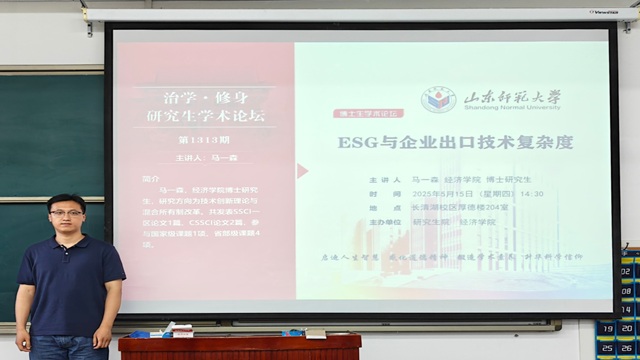 5月15日,经济学院于厚德楼204室举办“治学·修身”研究生学术论坛。此次学术论坛由博士研究生马一森担任主讲人,作主题为《ESG与企业出口技术复杂度》的学术报告,经济学院研究生参会。