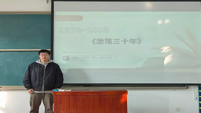 国际商务一组主讲人王科杰分享了《激荡三十年》一书。他首先介绍了作者吴晓波作为财经记者的从业经历,指出其作品既保留了新闻调查的现场感,又蕴含了对经济制度的深刻洞察。随后,主讲人围绕“三重共振”模型,从制度逻辑、社会心理与国际环境三个维度,系统梳理了中国1978至2008年间的经济变迁与企业发展脉络。最后,他指出,《激荡三十年》一书不仅是一部企业史,更是一部制度演进史与社会心态史,这本书提醒同学们在面对未来的不确定性与变革时,应秉持“长期主义”思维,将精力聚焦于自身能力的提升。