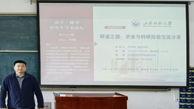 11月20日,经济学院于厚德楼204室举办“治学·修身”研究生学术论坛。本次论坛邀请应用经济学博士,中国人民大学国家发展与战略研究院博士后、经济学院国贸系青年教师李泽鑫担任主讲人,作主题为“研途之旅:学业与科研经验交流分享”的学术报告,经济学院研究生参会。