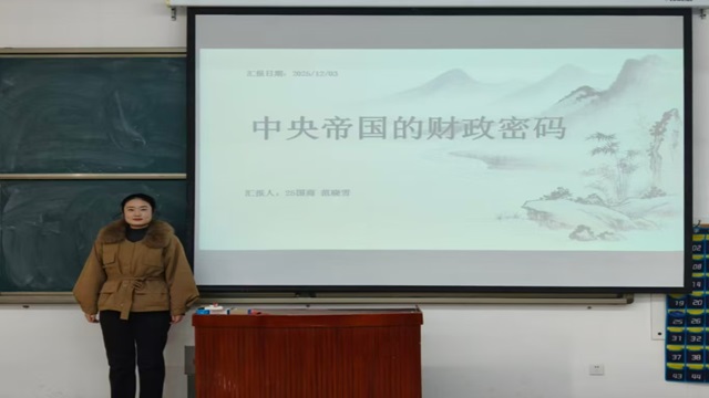 国际商务一组主讲人范晓雪分享了《中央帝国的财政密码》一书。她首先梳理了中国两千多年的财政史,总结出“王朝的兴衰更替,往往与土地、税收、货币等核心财政制度的得失紧密相连”这一规律;接着,她结合汉武帝盐铁专营、王安石变法等关键案例,阐述了历代中央帝国借助财政手段实现资源汲取、社会控制的过程;最后,她指出理解历史上的财政逻辑能为我们思考现代国家治理、财税制度改革提供独特视角。