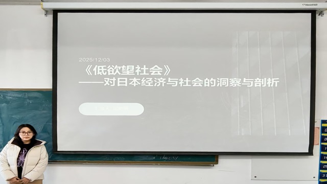 国际商务二组主讲人闵晓帆分享了《低欲望社会》一书。她首先介绍了本书的作者——日本著名管理学家大前研一;随后,主讲人指出,日本泡沫经济破裂后,国民在消费、生育和职业发展上的欲望全面走低。这一现象为我们理解经济增长的“软约束”问题提供了一个生动的案例与新视角。最后主讲人从个人、社会、心理三个层面分别阐述了“低欲望社会”的核心特征。