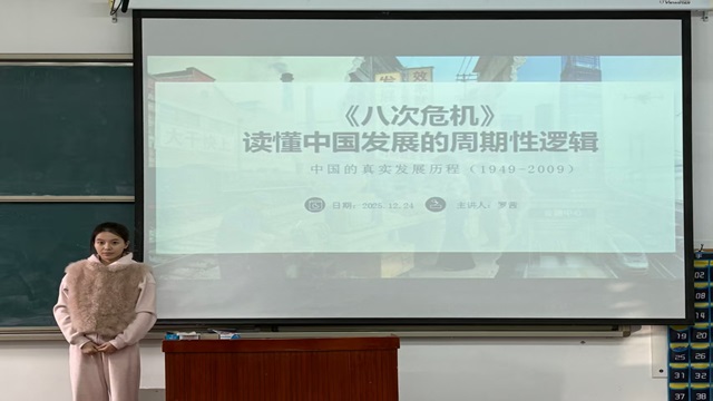 国际商务一组主讲人罗茜分享了《八次危机》一书。她首先系统梳理了1949-2009年间中国八次“发展型危机”的整体脉络与关键转折点;随后阐述了危机的本质——危机是社会结构、国际环境、体制转型等多重因素交织的结果;最后,她结合多个重点危机案例,指出国家与社会应通过全面推进乡村振兴激活农村潜力,以实现内外协调的新发展格局。