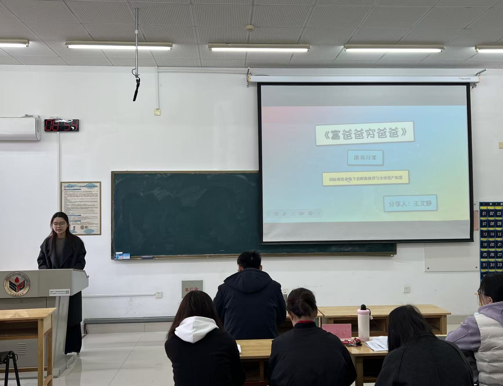国际商务二组主讲人王文静分享了《富爸爸穷爸爸》一书。她首先介绍了作者罗伯特・清崎(Robert T. Kiyosaki)的背景——美籍日裔企业家、投资家与财商教育专家。随后,主讲人解读了书中的核心财商理念,阐释了资产与负债的本质区别,强调树立正确金钱观、提升财商思维的重要意义。最后,她指出《富爸爸穷爸爸》一书对当代青年提升财富认知、规划职业发展具有重要的指导价值。