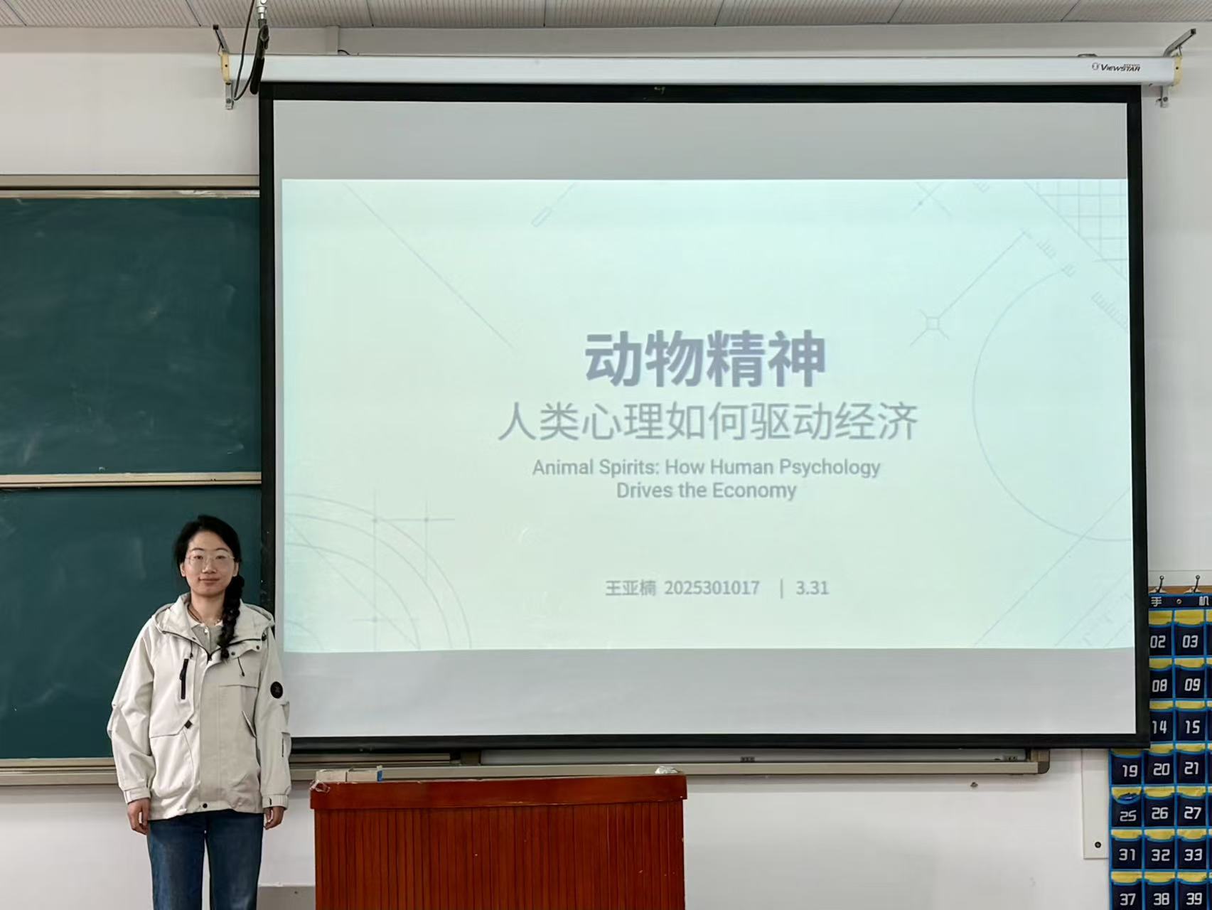 国际商务一组主讲人王亚楠分享了《动物精神》一书。她首先介绍了“动物精神”这一概念的起源,指出动物精神是经济波动的关键引擎。接着,主讲人指出信心作为最重要的动物精神,可引发经济扩张或收缩等一系列连锁反应。最后,她以2025年3月黄金市场波动这一案例为切入点,阐释了信心、叙事、公平感、货币幻觉、市场失信行为这五大因素如何相互作用、引发市场剧烈波动。