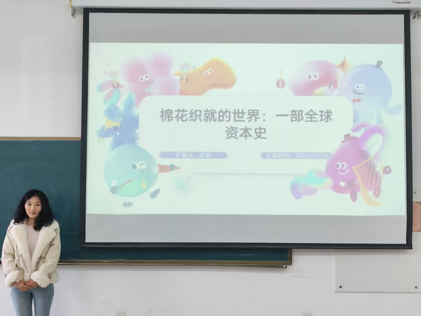 国际商务二组主讲人夏诺分享了《棉花帝国》一书。她首先以棉花产业的发展为切入点,剖析了全球资本主义的起源与历史演进。接着,主讲人讲述了欧洲商人通过武装贸易、金融创新嵌入亚洲网络的全过程。最后,主讲人结合当代全球化困境,指出棉花帝国的历史遗产仍深刻影响着当今供应链治理与劳工权益保护,为理解全球经济不平等问题提供了重要的历史视角。