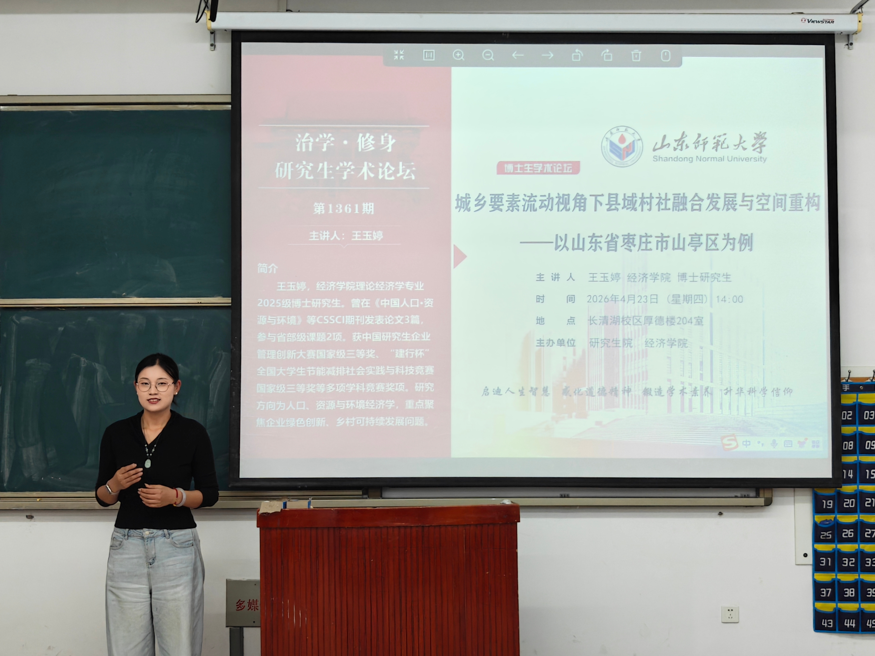 4月23日,经济学院于厚德楼204室举办“治学·修身”研究生学术论坛。此次学术论坛由经济学院博士研究生王玉婷担任主讲人,作主题为《城乡要素流动视角下县域村社融合发展与空间重构——以山东省枣庄市山亭区为例》的学术报告,经济学院研究生参会。