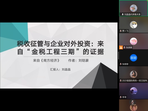 刘晶晶分享了题为《税收监管与企业对外投资:来自“金税工程三期”的证据》的文章。文章利用“金税工程三期”政策上线这一提高税收征管能力的准自然实验,采用双重差分法首次实证检验了税收征管对企业对外投资行为的影响作用。研究发现,“金税工程三期”这一增加企业纳税遵从度、促进“应收尽收”的税收征管政策冲击显著地提高了企业对外投资的可能性、增加了企业对外投资规模,并且这一结论在引入更多控制变量并排除同期其他政策干扰、安慰剂检验、更换样本周期、倾向得分匹配分析等条件下依旧稳健。