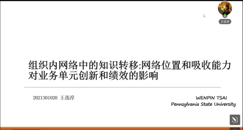 王选淳分享了题为《组织内网络中的知识转移:网络位置和吸收能力对业务单元创新和绩效的影响》的文章。文章基于组织学习的网络视角并利用某石化公司 24 个业务单元和某食品制造公司 36 个业务单元的数据通过层次回归分析,研究发现,吸收能力与网络地位之间的相互作用对业务单元的创新和绩效有显著的正向影响,据此,作者提出结论,如果组织单位占据中心网络职位并能够访问其他单位的新知识,它们就可以产生更多的创新进而获得更好的绩效,这种效果取决于单位吸收能力或成功复制新知识的能力。