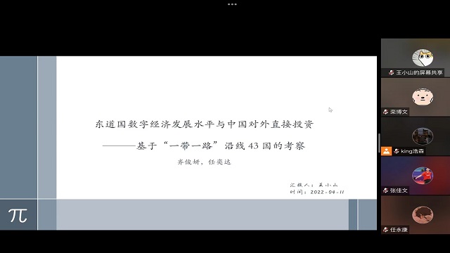 王小山分享了题为《东道国数字经济发展水平与中国对外直接投资——基于“一带一路”沿线43国的考察》的文章。文章采用主成分分析法定量测度“一带一路”沿线43个国家的数字经济发展水平,并实证检验了东道国数字经济发展对中国对外直接投资区位偏好和规模变化的影响。研究发现,“一带一路”沿线国家间数字经济发展水平差距明显,但东道国数字经济发展水平却显著促进了中国对“一带一路”沿线国家直接投资规模的提升。