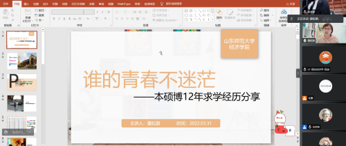 为做好疫情防控形势下的学生心理疏导和学业指导,加强师生沟通交流, 3月31日,经济学院通过腾讯会议成功举办“经彩启迪”研途畅享会。此次畅享会特邀经济学院讲师董虹蔚担任主讲人,做主题为《谁的青春不迷茫:本硕博12年求学经历分享》的经验分享,经济学院博士、硕士研究生参会。