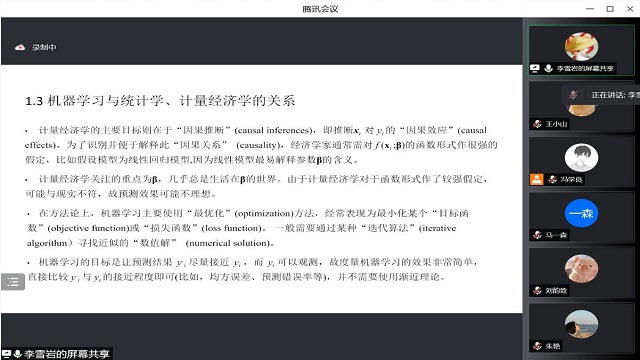 5月14日,经济学院通过腾讯会议成功举办厚德论坛—“经彩技扬”学术研习会(第五期)。此次活动特邀经济学院讲师李雪岩担任主讲人,做主题为《机器学习基础方法与经济学应用》的软件操作经验分享,学院博士、硕士研究生在线参会。