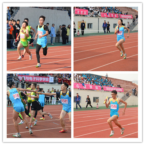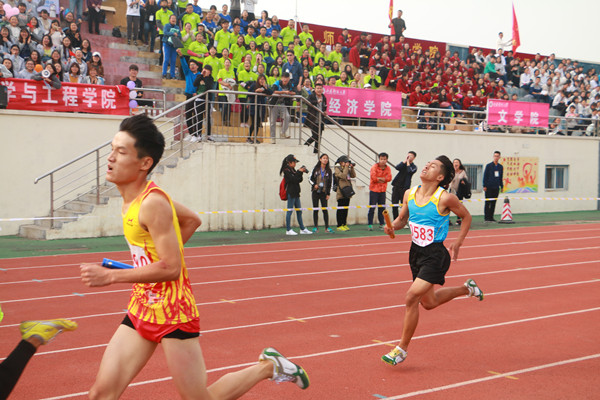 赛场上,运动健儿顽强拼搏,超越自我,赛出水平,赛出风格。率先开始的男子100米比赛的赛道上气氛紧张,运动员们斗志昂扬,严阵以待。枪声响起,运动员如离弦之箭般冲出。观众席上,同学们在体育部有组织的带领下为运动员们呐喊助威,热情高涨。在观众焦灼热切的注视下,彭永鑫率先冲线,夺得冠军,为经院拿下第一金。女子800米比赛同样备受关注。赛前,运动员不时高抬腿、活动膝关节以放松身体,缓解紧张情绪。这是一场耐力与信念的较量。在观众的呐喊加油声中,运动员们忽略疲惫,奋力向前。最终,周梦玉夺得季军,为学院再创佳绩。而在学院传统的强势项目女子4×400米上,龙钰、衣彩娇、周梦玉、燕晓青四人顶住压力,奋力拼搏,帮助经济学院成功卫冕,再下一金。径赛场上气氛火热,田赛场上气氛也十分紧张。胡彦丽在沙坑前的纵身一跃,邓明睿于跳高杆前的奋力腾空,喜获第四、五名,为经济学院在本次校运会上的优越表现添砖加瓦。