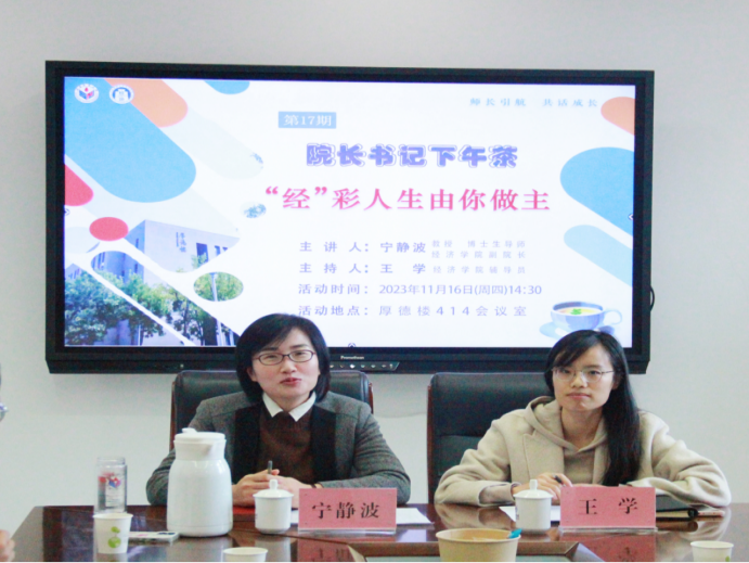 11月16日下午,经济学院于厚德楼414会议室举办第十七期“院长书记下午茶”活动。本期活动以“‘经’彩人生由你做主”为主题,由经济学院副院长宁静波主讲,2022级辅导员王学主持,各年级学生代表参与活动。