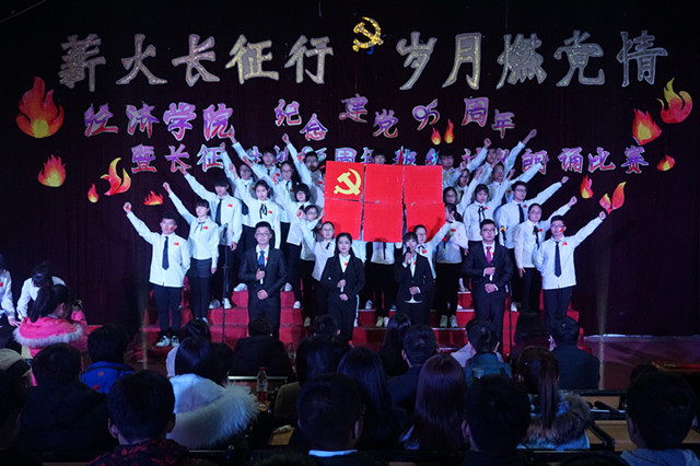 往事回首,中华民族尽展坚韧雄姿;而今阔步,经院学子难忘红色深情。本场比赛主题鲜明、内容明确,歌曲、舞蹈、朗诵、情景剧表演等多种节目表演类型和谐共融,为观众呈现了一场别开生面的视听盛宴。一曲《中国龙》,舞动中国风,势如破竹的武术表演与铿锵激昂的歌声交织,为比赛正式拉开序幕。16级经济二班率先登台,《忆峥嵘岁月,望华夏盛世》朗诵形式丰富多样,饱含深情的诗词再现红军傲骨,声声入耳、字字入心,令观众不由为之动容。 16级金融二班别出心裁,朗诵的同时挥毫泼墨,以苍劲的笔力,畅快淋漓的书写出大国崛起、还看今朝的时代最强音。古香诗韵,试问闲愁几许,舞扇蹁跹,聆听筝声悠扬,串场舞《落花情•风姿花》惊鸿一舞,展现了风姿绰约的古典之美。随后,16级金融三班以情景剧演绎长征精神,激荡的诵声展现共产党不畏艰险的奉献精神;国贸二班同学演绎的《悠悠九五载,泱泱大中华》则用电子琴与小提琴双伴奏,奏响风雨过后的时代新篇章。旗袍佳人,小调婉转,那京片子戏曲《红灯记》唱出了国人心中永远不灭的经典,将比赛推至高潮,赢得观众真挚的喝彩与掌声。串场的话剧《我叫赵建军》令人印象深刻、笑料不断,在插科打诨中展现了令人泪目的深厚战地情谊,正是这样一群不为功名的英雄,撑起了中华民族的无字丰碑。研究生新生用一首《长征颂》从历史与当代的诸多角度表达了共产党员永恒的信念,体现了党员的高度觉悟。最终,经过激烈角逐,16级国贸二班凭借出色的表现荣获一等奖,期货班和研究生班级获得二等奖,经济一班、金融三班、国贸一班喜获三等奖,经济二班、金融一班、金融二班获优秀奖。最后,歌曲《黄种人》老歌新唱,在动感的旋律与雷动的喝彩声中本次比赛圆满落下帷幕。