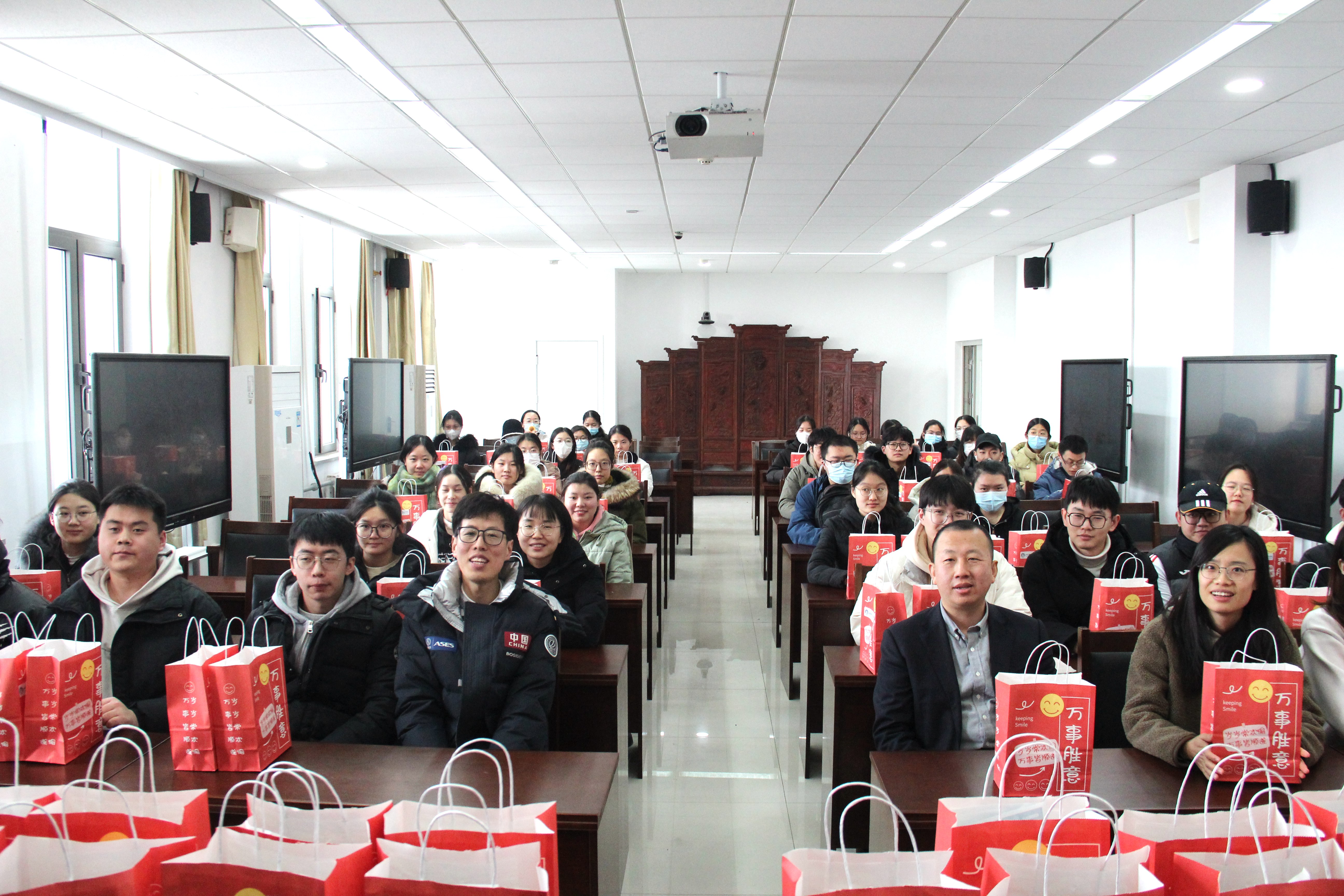 随后,学院领导为考研学子送上精心准备的“考研爱心大礼包”。本次慰问活动共发放80余份大礼包,其中包含着寓意“牛气冲天”的牛奶、“心想事成”的脐橙、“平安顺遂”的苹果,以及象征着“一举夺魁”的葵花挂饰、“一研为定”的可乐和“百毒不侵”的口罩。每一只礼包都饱含着学院领导师生们对考研学子温暖的问候,寄托了对同学们金榜题名的美好祝愿。最后,师生一同合影留念,活动在一片欢声笑语中落下帷幕。