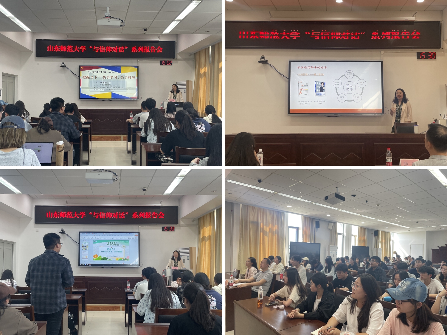 在现场交流环节,针对同学们提出的如何开启科研之旅、如何解决内耗等问题,她表示同学们切勿急于求成,应当先夯实专业知识与数学能力基础,逐步积累研究能力,以精准数据和扎实知识支撑科研学习。此外,她建议同学们把握当下,着眼于现阶段的学习生活重点,学会合理排解情绪压力,以积极向上的状态面对未来的挑战。