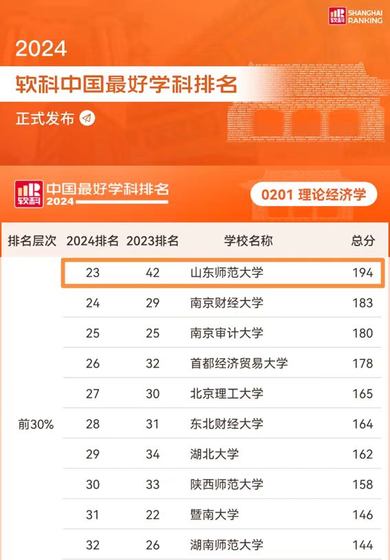 近日,高等教育评价专业机构软科正式发布“2024软科中国最好学科排名”,我院理论经济学学科位于前30%,全国排名第23,较2023年提高19个位次,位居山东省属高校第一。