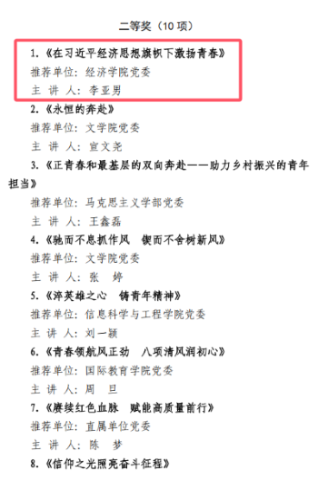 教工第一党支部以《党旗引领 融合赋能:经济学院教工第一党支部 “1+3+3+4”党建品牌领航高质量发展》为题,总结党支部紧紧围绕“党建水平和业务能力双提升” 这一核心目标,在教学上畅通三条路径,在科研上发力三个维度,在社会服务上拓展四方辐射,以高质量党建引领教学、科研、社会服务“三位一体”高质量发展的生动实践。李亚男的党课以《在习近平经济思想旗帜下激扬青春》为题,紧扣时代主题,引导青年学子汇聚在习近平经济思想的旗帜下,解锁新时代青年党员的三重身份——做先进理论的“追光者”,做经济研究的“深耕者”,做经世济民的“奉献者”,在服务强国建设的青春实践中绽放经济学人的时代风采。